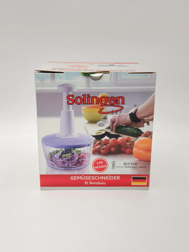 خرد کن دستی مدل EL RONDOSO R061 برند solingoen آلمان یک وسیله کاربردی است که برای خرد کردن مواد غذایی مختلف در آشپرخانه مورد استفاده قرار می گیرد . این دستگاه شامل یک مخزن با تیغههای تیز در داخل آن است که با فشار دادن دسته آن ، مواد غذایی را به قطعات کوچکتر خرد میکند. این ابزار برای خرد کردن انواع مواد غذایی از جمله سیر،پیاز، انواع سیفی و سبزیجات و انواع ادویه جات مناسب است و از یک سو سرعت کار را بالا برده و از سوی دیگر جلوی آلوده شدن و بو گرفتن دست و سوزش چشم را می گیرد لذا داشتن این خردکن دستی در آشپزخانه بسیار لذت بخش و باعث آسودگی خاطر خواهد بود. تیغه های این ابزار از جنس استیل ضد زنگ و با کیفیت بالا ساخته شده اند و مواد را به بهترین شکل ممکن خرد میکند.